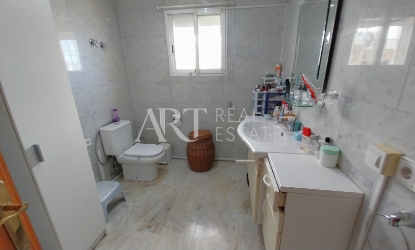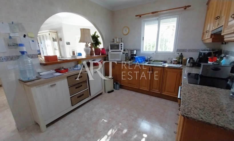 En la planta baja hay un luminoso salón-comedor con acceso a una terraza cubierta, piscina y jardines. Además de una cocina totalmente equipada con aire acondicionado, hay una despensa independiente. Desde el pasillo se accede a un dormitorio doble con aire acondicionado, armarios empotrados y puertas que dan directamente a la terraza. Además, hay un amplio baño con ducha y WC, así como un aseo de invitados. Al final del pasillo se encuentra un segundo dormitorio doble con aire acondicionado y armarios empotrados. Toda la planta cuenta con calefacción por suelo radiante.