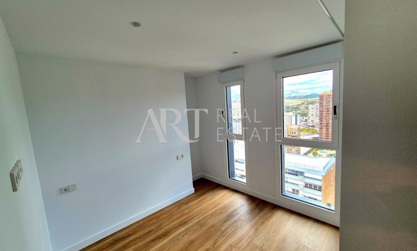 Le presentamos un hermoso apartamento a estrenar en pleno centro de Benidorm, a pocos pasos de la playa y ubicado en la famosa Avenida Mediterráneo. Este amplio apartamento de 3 dormitorios con hermosos acabados le permite convertirse en el propietario de la planta 15 de este increíble edificio nuevo. La entrada y el vestíbulo le dan la bienvenida desde la bulliciosa calle. Acceda al edificio con un intercomunicador con código de llave eléctrica y un sistema de alarma que también se puede activar a través de su teléfono móvil. Al subir al ascensor, llegará a su planta, que al abrirse las puertas, se convertirá en su espacio personal y privado. La puerta principal se abre a un amplio recibidor donde encontrará una habitación amplia con grandes ventanales de suelo a techo, ideal como oficina con fabulosas vistas o como un tercer dormitorio. A continuación, encontrará un baño completo con una amplia ducha a ras de suelo. Otro dormitorio de buen tamaño, también con grandes ventanales de suelo a techo que dejan entrar mucha luz. El dormitorio principal cuenta con un precioso baño en suite con acabados de alta calidad, lavabo doble y otra amplia ducha a ras de suelo. El dormitorio principal cuenta con armarios empotrados y da acceso directo a una amplia y soleada terraza orientada al sur, con amplio espacio para comer, tomar el sol y relajarse. La terraza ofrece las vistas más hermosas de toda la ciudad y es un placer contemplarla tanto de día como de noche. A pesar de ser un apartamento céntrico, el ruido es prácticamente nulo, ya que se encuentra a metros de las calles más transitadas.