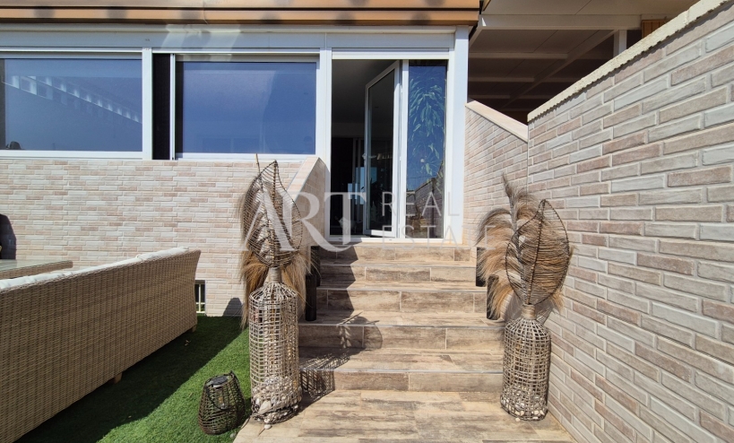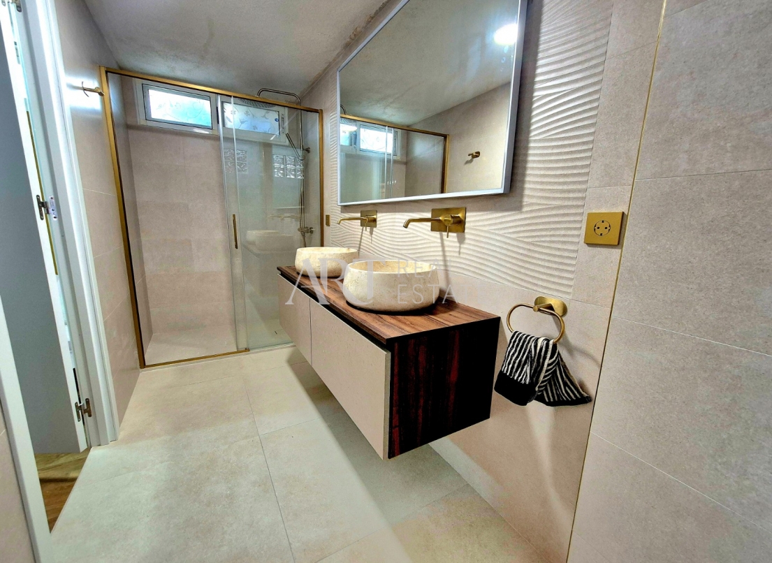 La casa se distribuye en 4 plantas. En la planta intermedia se encuentran dos amplios dormitorios con baño privado. El principal cuenta con un pequeño balcón con preciosas vistas al mar y a la montaña. La planta superior es un encantador solárium con vistas panorámicas. La planta baja cuenta con un garaje privado para un coche y una entrada privada para un segundo vehículo, protegida con portones eléctricos. Dispone de un amplio trastero, un lavadero y otro dormitorio con baño privado, lavabo doble y ducha de alta presión.