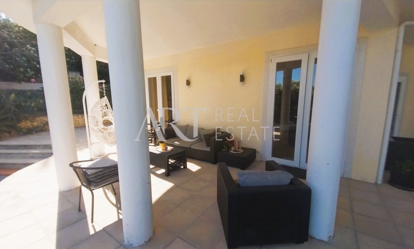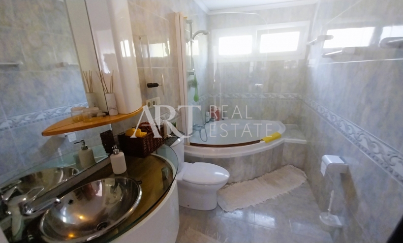 A total of three bedrooms are located on the upper floor. There is a large terrace off one of the bedrooms that offers views of the sea and the mountains. An office is located in one of the other bedrooms. The bedrooms are all equipped with built-in wardrobes. As well as a complete bathroom separate from the bedroom. A nicely maintained garden surrounds the property, which includes a private swimming pool. The plot also has an outdoor parking area with space for several vehicles.